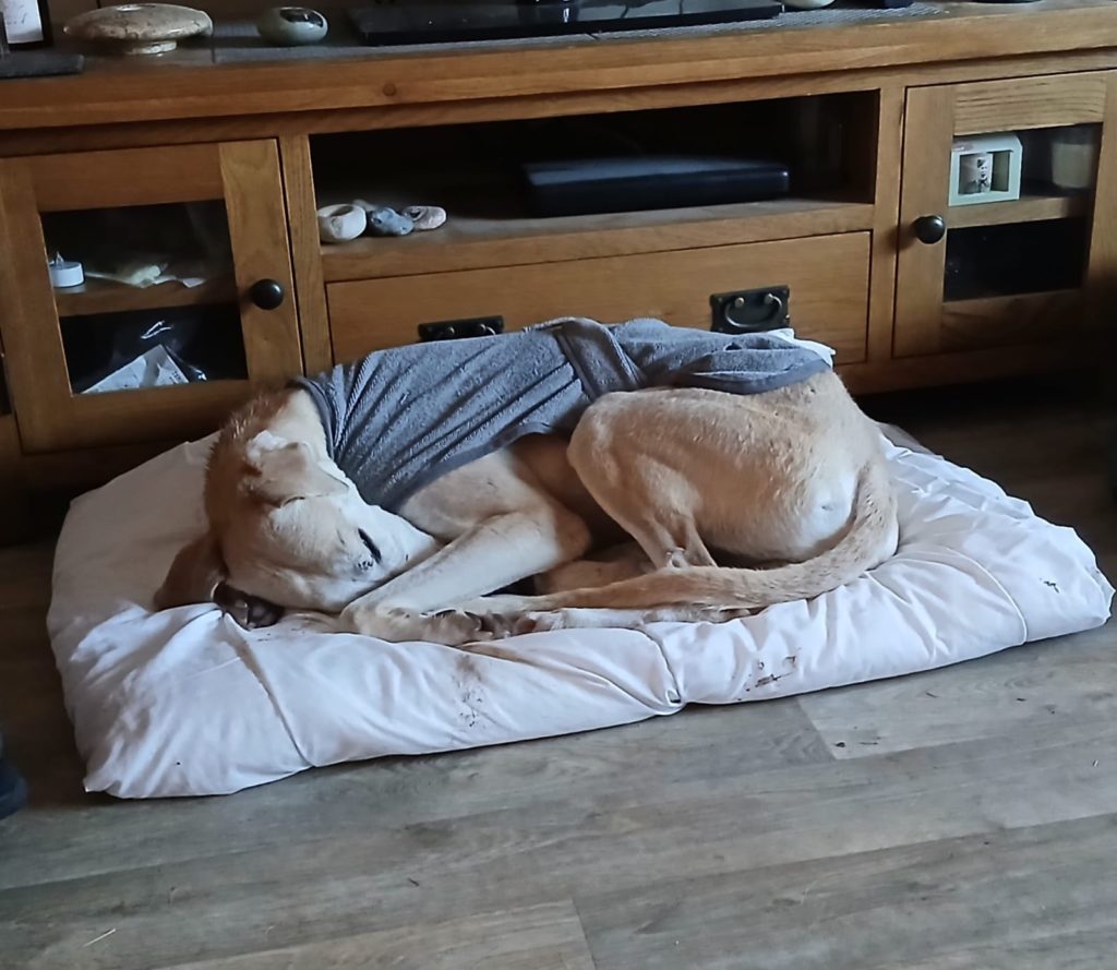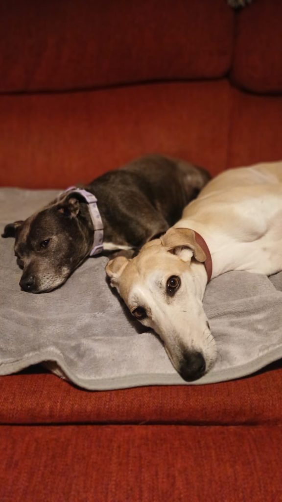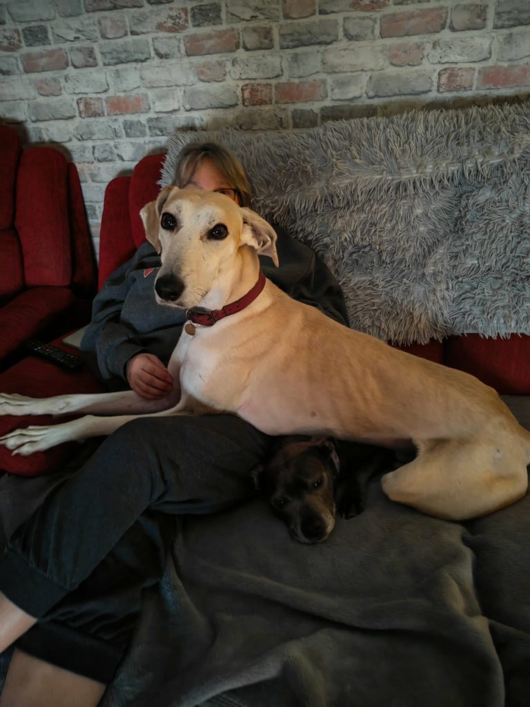 Lemmy would ideally suit a home with another dog, preferably someone with hound experience, and possibly another hound so he can play roughly with them and have someone to chase in the fields, however he has proven to adapt to different breeds and has been living with a Staffordshire Bull Terrier as well. He’s a bit unsure with smaller dogs but loves a good play. He gains his confidence from being around other dogs and learning their social cues.